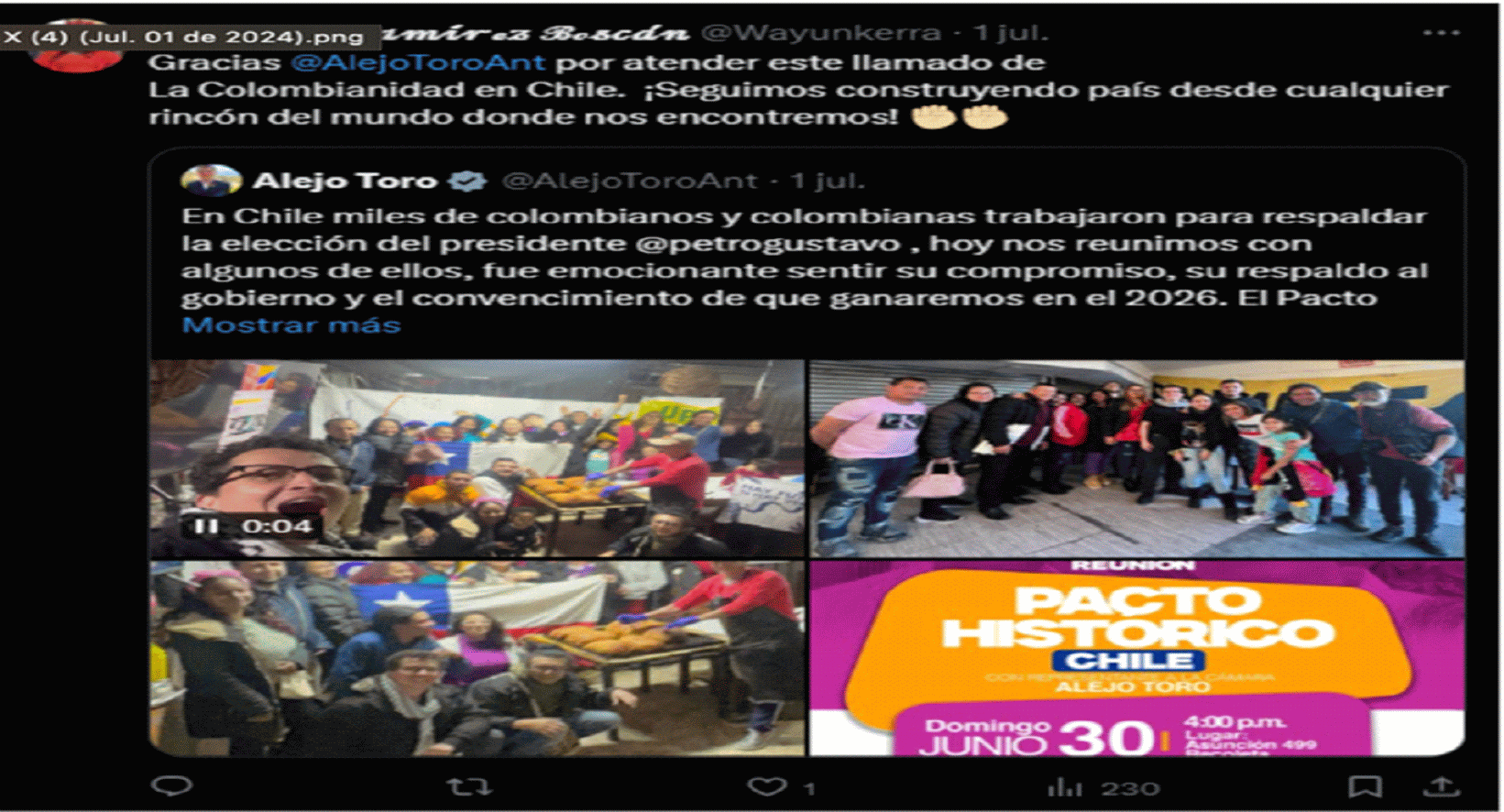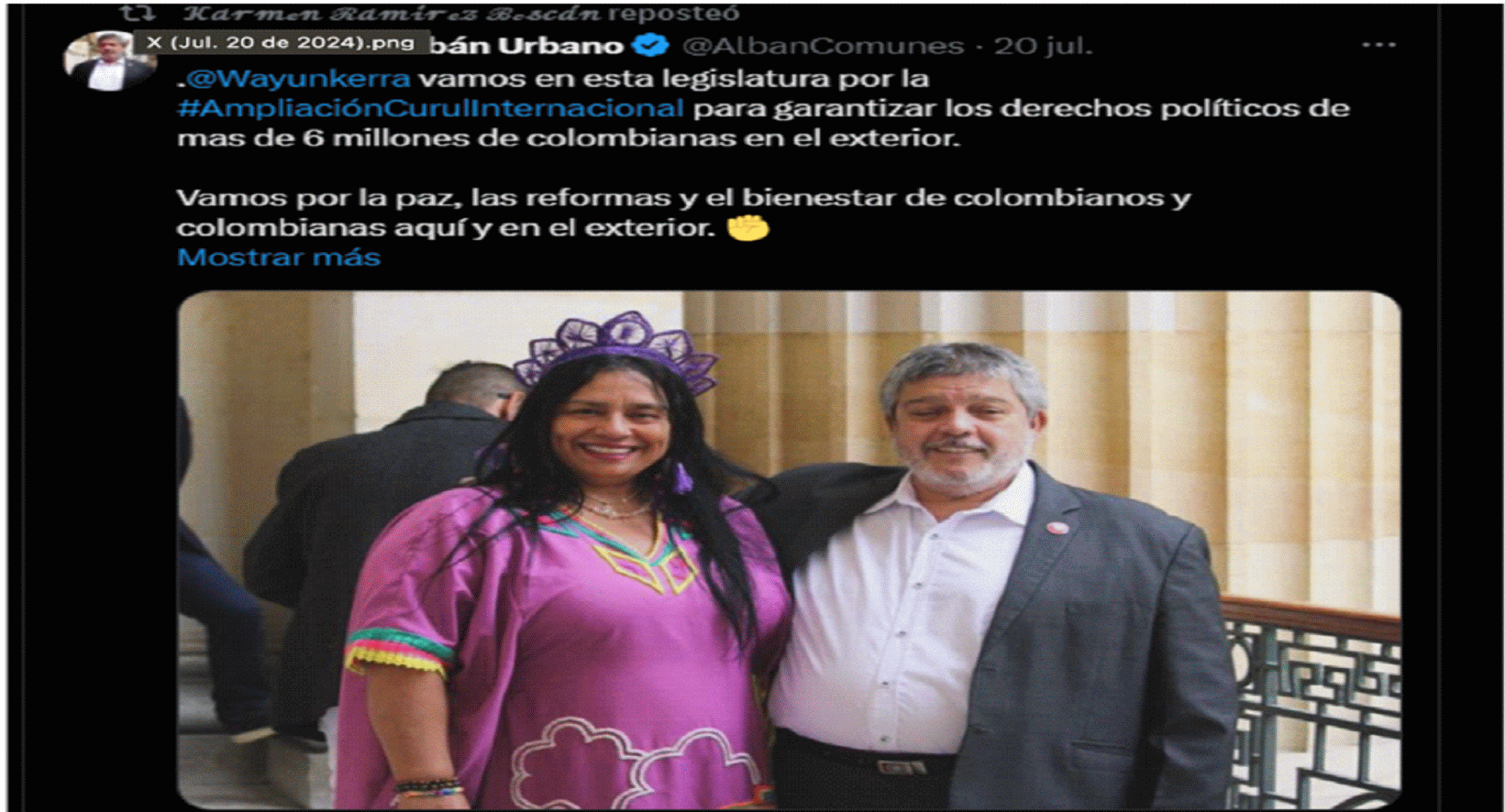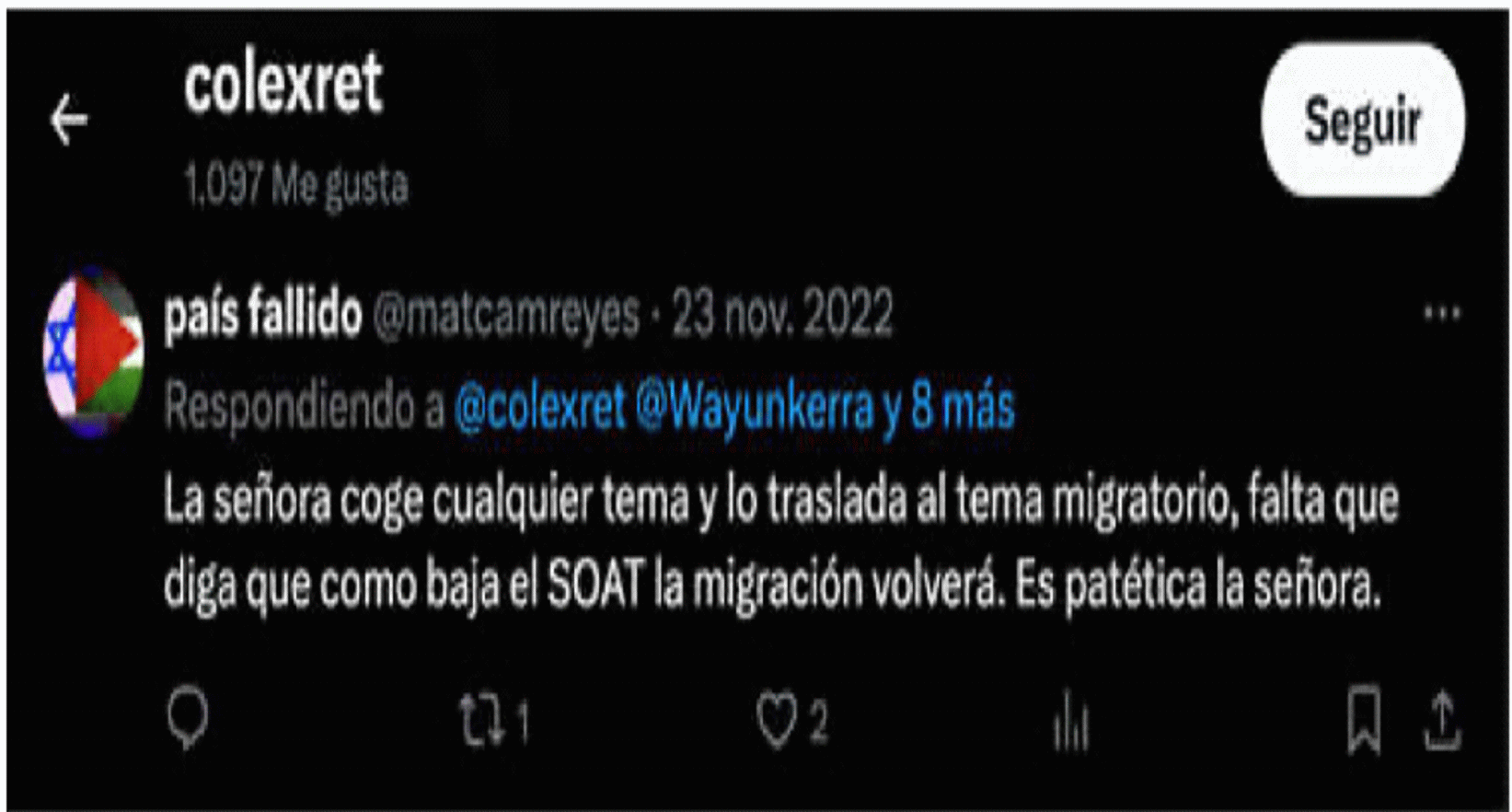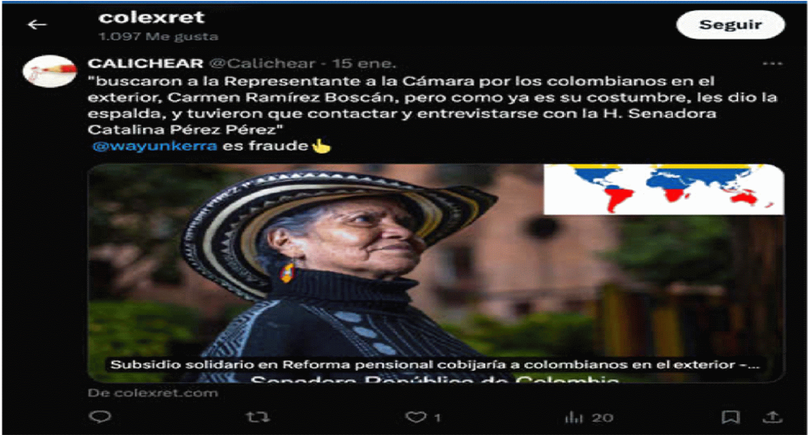 | “Para eso y mucho más fue elegida por la Diáspora, pero es una mediocre e inepta”. | Red social X – Perfil de COLEXRET | Este mensaje fue publicado por el actor el 3 de noviembre de 2011, en el marco de un hilo de publicaciones en X sobre el artículo denominado “Con mentiras y amenazas Congresista elude prestar ayuda a colombiana fallecida en el exteriorhttps://www.colexret.com/politica/con-mentiras-y-amenazas-congresista-elude-prestar-ayuda-a-colombiana-fallecida-en-el-exterior/, columna de opinión que fue divulgada el 1 de noviembre de 2023 en el sitio web de COLEXRET. En el artículo, el actor asegura que la accionada afirmó no poder prestar apoyo, ayuda y acompañamiento a los familiares de una ciudadana colombiana que falleció en un accidente de tránsito en Estados Unidos, en razón a la situación migratoria en la que se encontraba la mujer fallecida. Al respecto, refiere que el comportamiento de la congresista denota “ineptitud, mediocridad , falsedad, mentira ignorancia” y desconocimiento de la normativa migratoria. | |