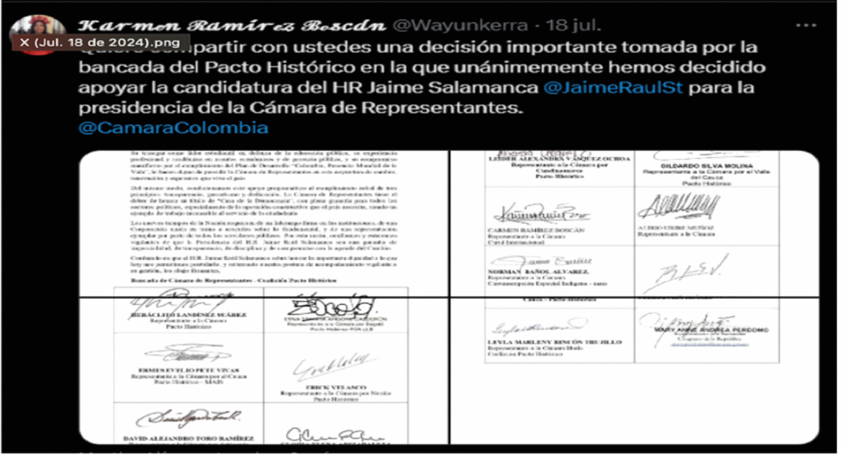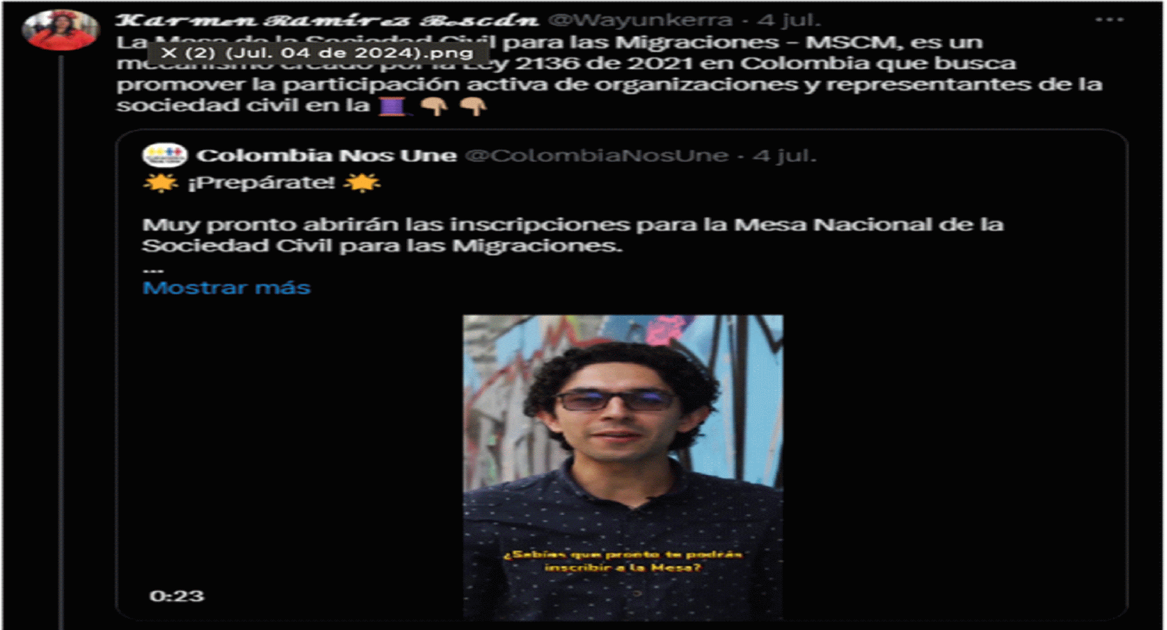Como sustento de lo anterior, aportó los siguientes pantallazos en los que constan publicaciones y comentarios del accionante, mediante la cuenta de X de COLEXRET, en los que se refiere a Carmen Felisa Ramírez Boscán. Estos son de noviembre y diciembre de 2022 y noviembre de 202: