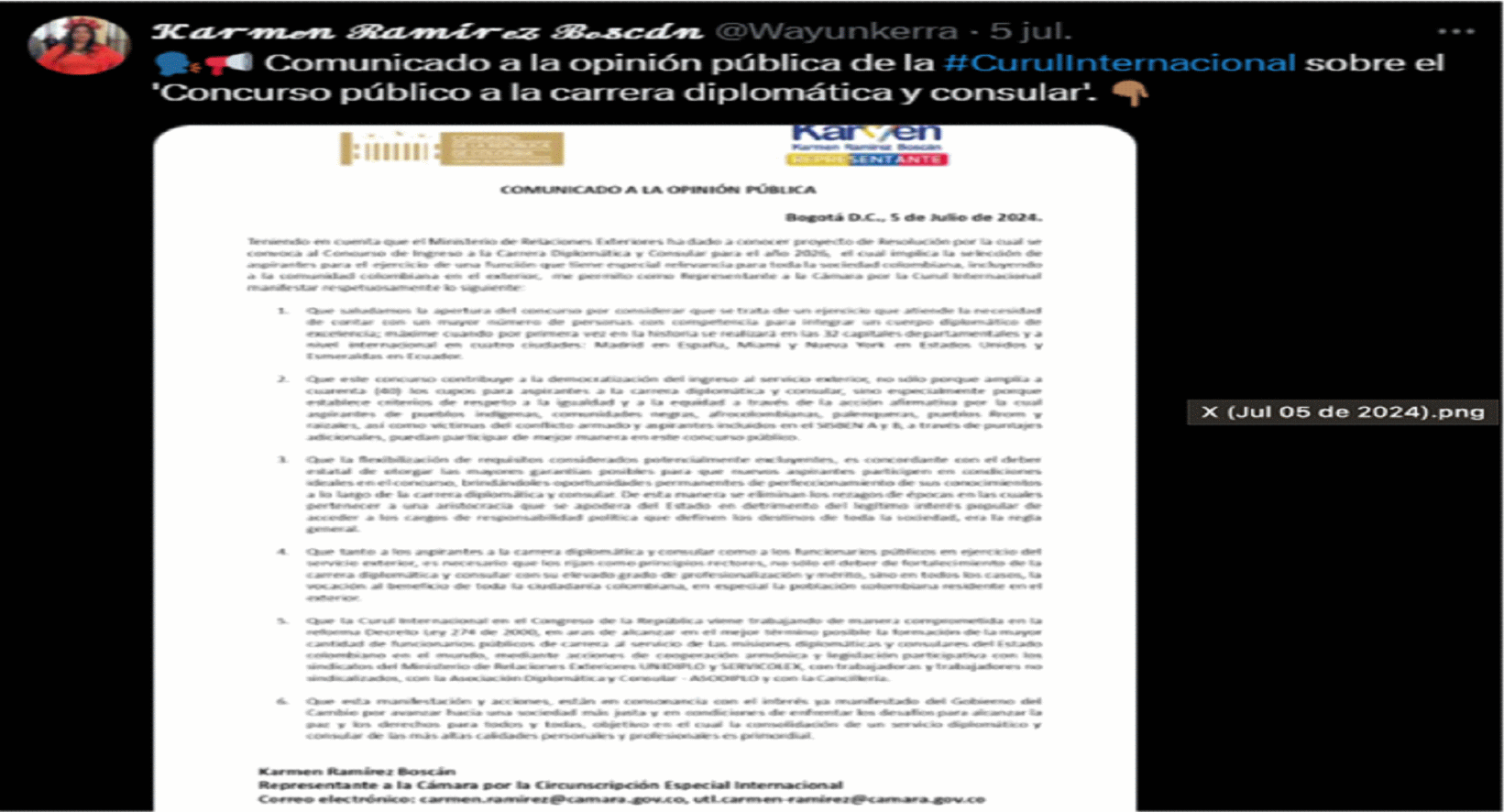 Asimismo, señaló que: “Las redes sociales de la actual Representante por la Circunscripción Internacional (Twitter, Facebook, Instagram, TikTok) son de carácter personal y usadas libremente para difusión de algunos asuntos de su gestión institucional, sin embargo, tampoco representan un canal de comunicación oficial con la ciudadanía, dada la suficiencia de canales institucionales.