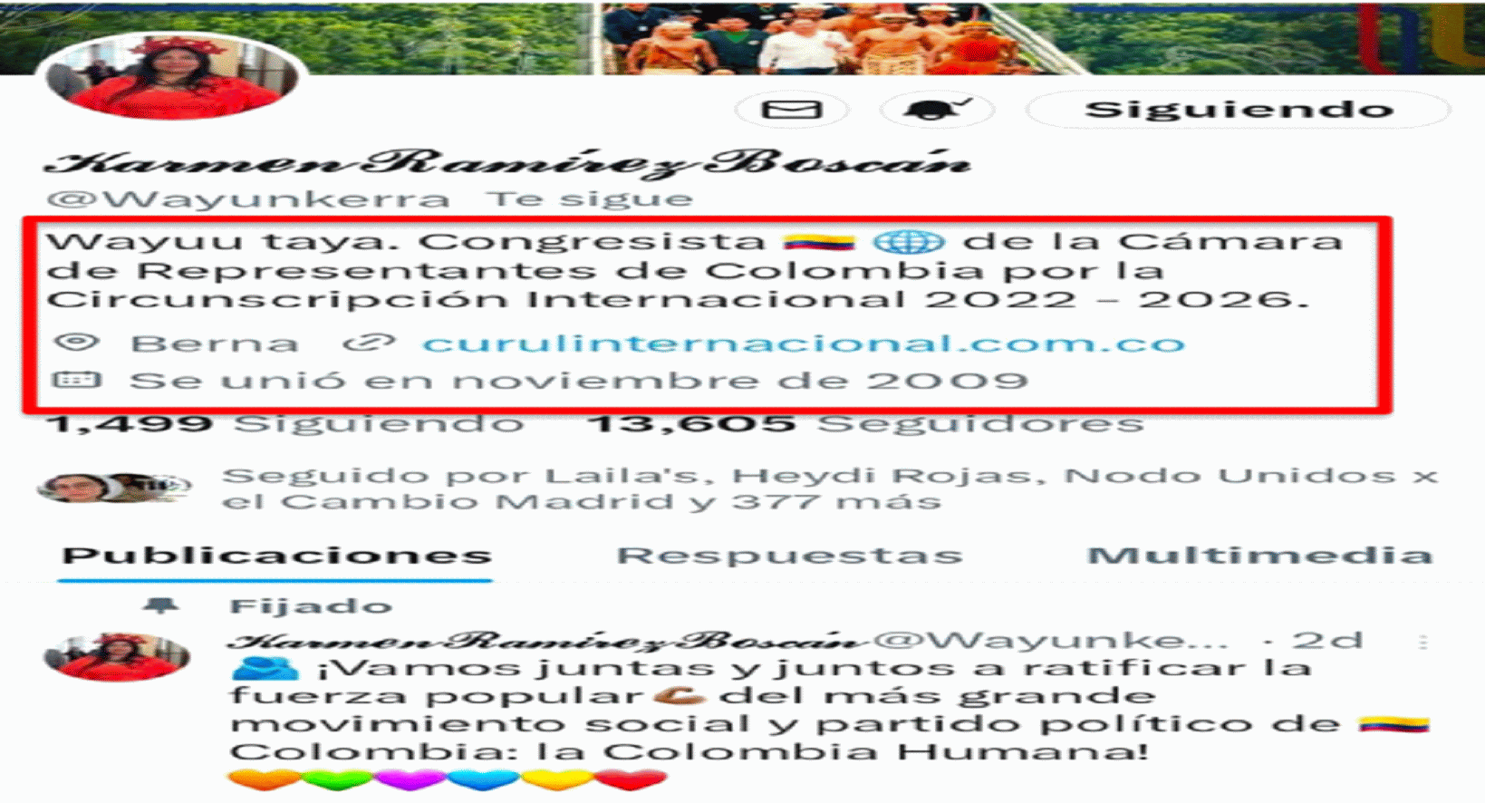 (i) El 27 de diciembre de 2022, en respuesta a la petición radicada No. FM-JD-054-22, indicó que sus perfiles en redes sociales fueron usados como mecanismo de divulgación de información relacionada con el desempeño de su cargo, mientras se creaba la página web https://curulinternacional.com.co. Al respecto, indicó que, si bien publica información relacionada con su ámbito laboral, entre otros asuntos de interés general, sus perfiles en redes sociales son de carácter personal y no constituyen canales oficiales de comunicació.