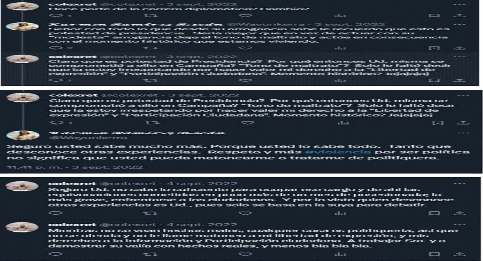 El demandante señaló que el 3 y 4 de septiembre de 2022, sostuvo un intercambio de opiniones con la accionada en la red social X. Posteriormente, la accionada bloqueó los perfiles de COLEXRET y del actor de Facebook y . En particular, en la acción de tutela se anexaron los siguientes pantallazos de la discusión referid: