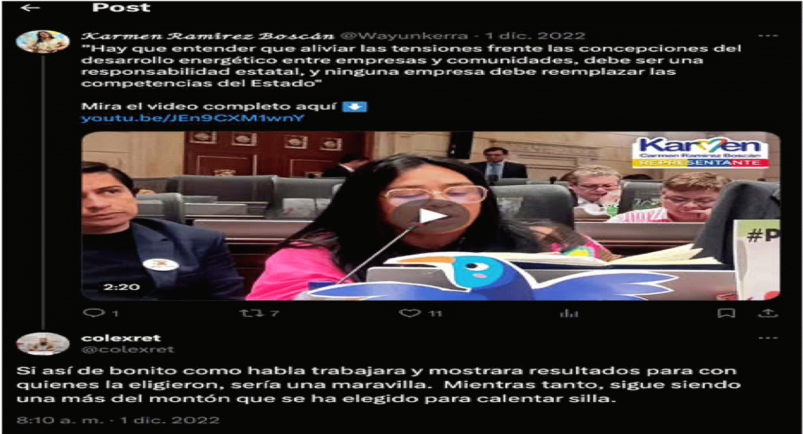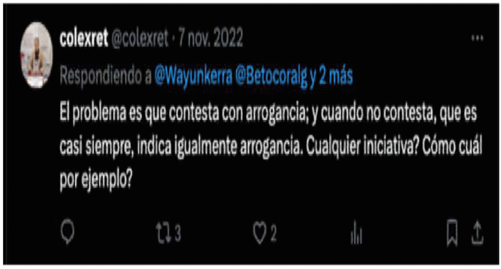 | “El problema es que contesta con arrogancia; y cuando no contesta, que es casi siempre, indica igualmente arrogancia. Cualquier iniciativa? Como cuál por ejemplo?” | Red social X – Perfil de COLEXRET | Este mensaje fue publicado por el accionante el 7 de noviembre de 2022. Lo anterior, en el marco de una dinámica de interacción o conversación con la accionada y otros usuarios de la red social X sobre las respuestas dadas por la congresista a las solicitudes presentadas por la ciudadanía y los periodistas que pretenden ejercer control político sobre su gestión. | |