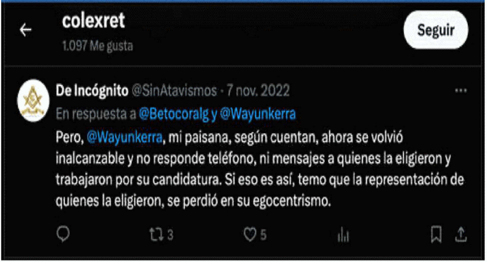 | “Si considera que la estoy maltratando o irrespetando, denúncieme ante la Justicia, pues el irrespeto a una autoridad es castigable. Pero ya deje tanto bla bla bla y empiece a mostrar resultados. Llegó a aprender, o a ejecutar lo aprendido”. | Red social X – Perfil de COLEXRET | Este mensaje fue publicado por el accionante el 3 de septiembre de 2022. Lo anterior, en el marco de una dinámica de interacción o conversación con la congresista accionada (@wayunkerra) sobre las facultades del presidente de la República y los compromisos de campaña de la demandada. | |