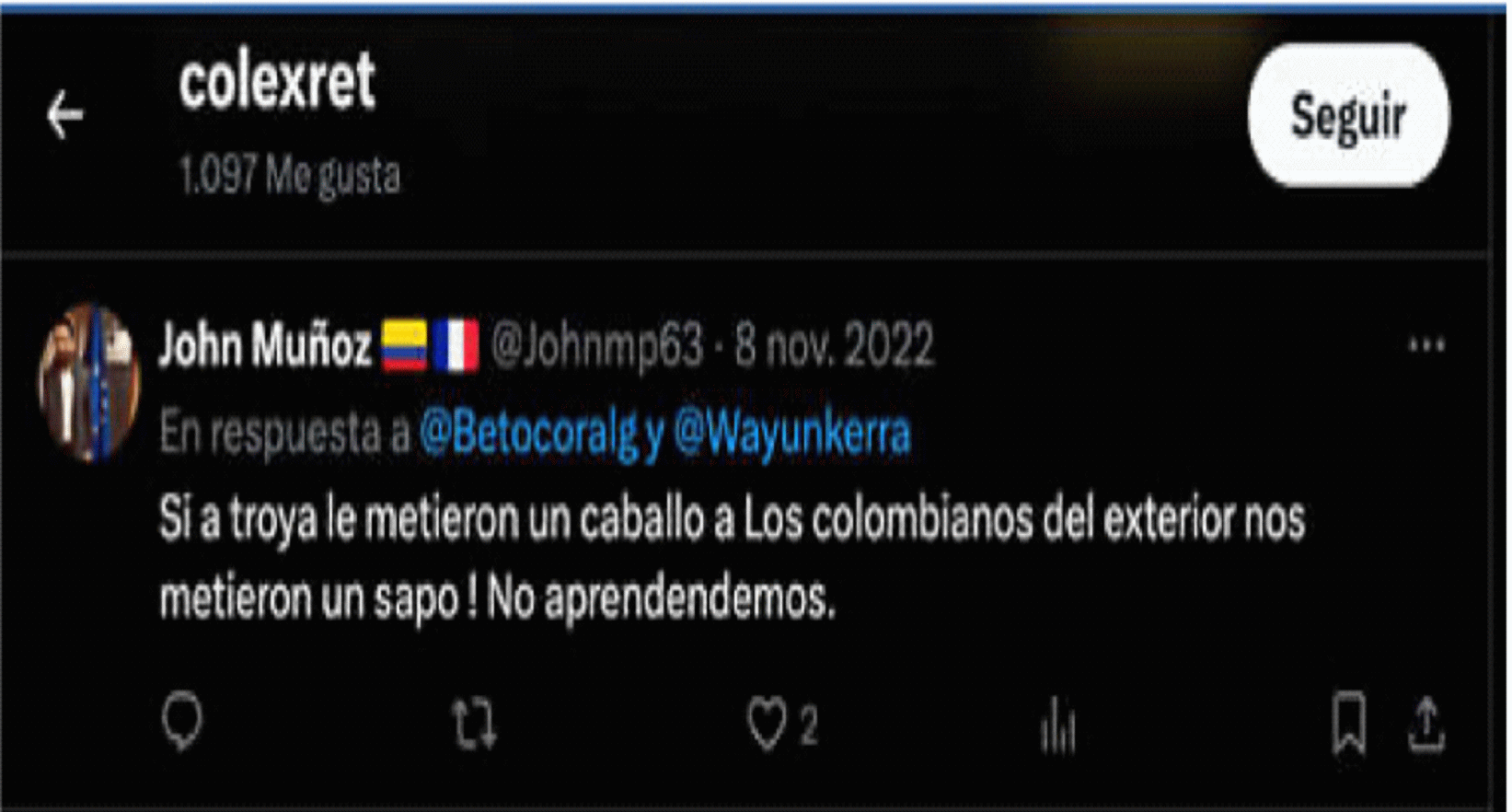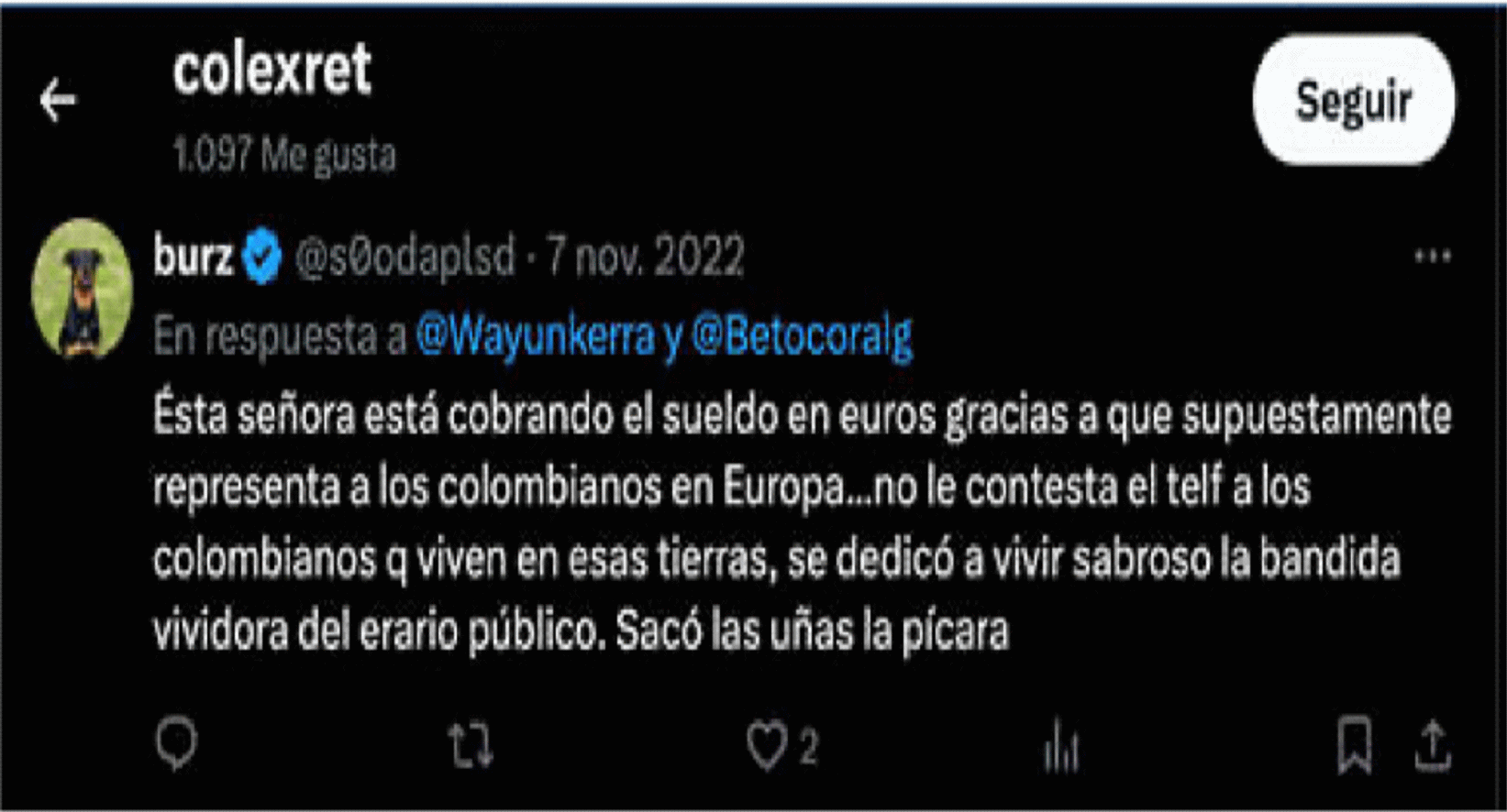 Asimismo, el apoderado de la accionada anexó los siguientes pantallazos de mensajes publicados por otros usuarios de la red social X, en los que, a su juicio, se evidencia la interacción del perfil de COLEXRET ya que les dio “me gusta” o los compartió. Estos fueron emitidos en noviembre de 2022, diciembre de 2023 y enero de 202.