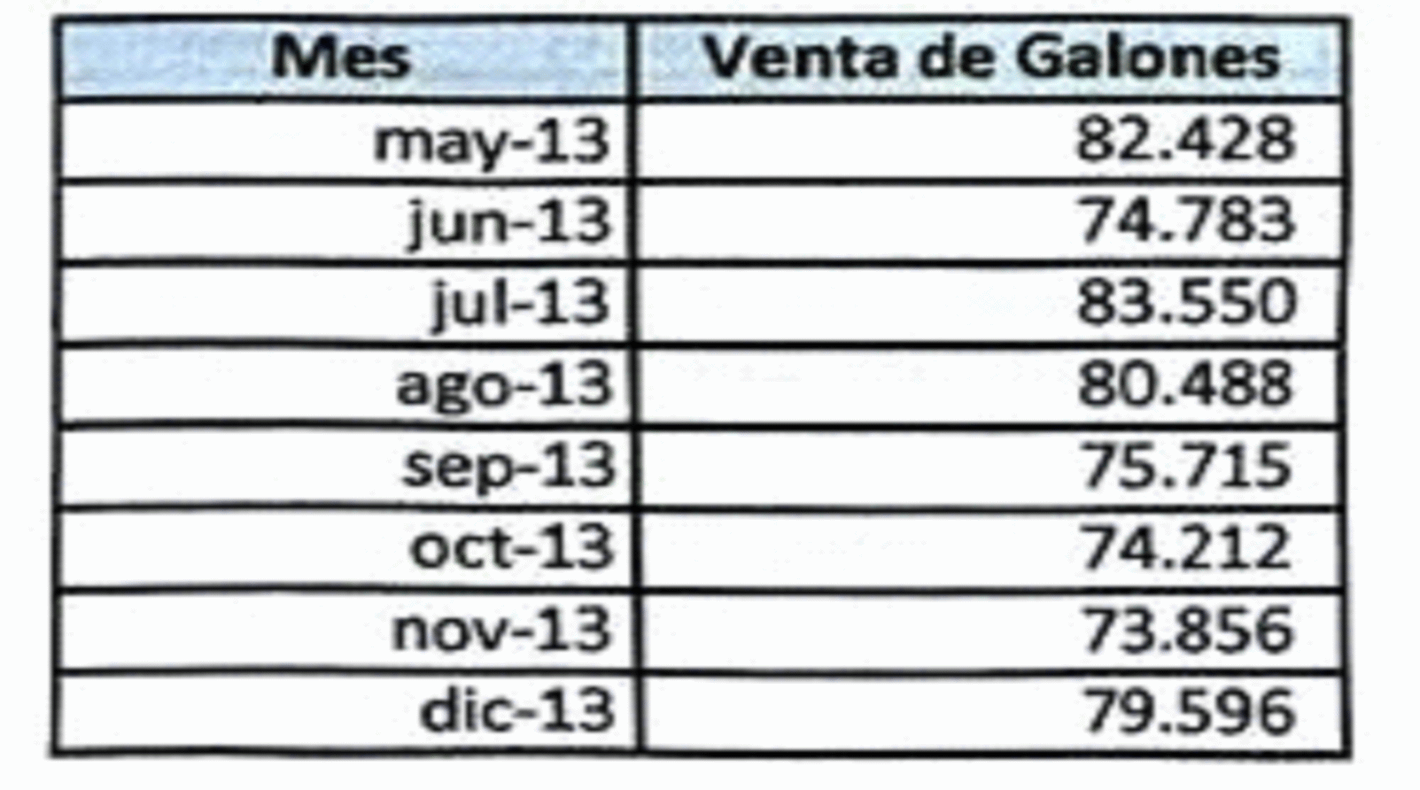 Realizó un promedio de ventas de la estación de combustible de los años 2011 y 2012, teniendo en cuenta que “inició operación en mayo de 2011”, concluyendo que “[E]sta evolución positiva en el comportamiento de ventas de la compañía, al pasar de 75,586 [2011] a 107,171 [2012] galones mensuales vendidos, equivalió a un crecimiento del 41,8% de las ventas” y, a su vez, el cálculo de ventas promedio del año 2013 lo sacó teniendo en cuentas las ventas de mayo a diciembre de 2013, lo que arrojó un resultado de 78,078 galones vendidos mensualmente. Como se observa, las ventas mensuales de los años 2011 y 2013 fueron promediadas con base en las transacciones realizadas de ocho meses (mayo a diciembre), que de hecho tuvieron promedios de ventas similares, 2011: 75,586 y 2013: 78.078 galones; en cambio, las ventas del año 2012 se calcularon con el promedio de los 12 meses del año y, por obvias razones, arrojó un promedio de ventas mensuales más alto.