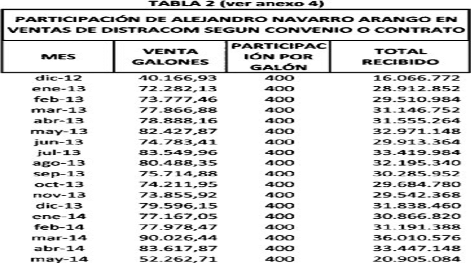 78. Adicionalmente, el experto tasó la utilidad neta por galón de gasolina en $600, dato sobre el que la sala tiene información diversa que impide conferirle el grado de certeza que se necesita, pues según se ha referenciado, distintos medios de prueba acreditan que el margen era de $400 desde el 19 de diciembre de 2012, debido al negocio que había celebrado la Corporación Navarro Cía. S.A.S. con Distracom S.A., el cual afirmó conocer para el momento en que elaboró el informe –ver párrafo 49 de esta providencia–.