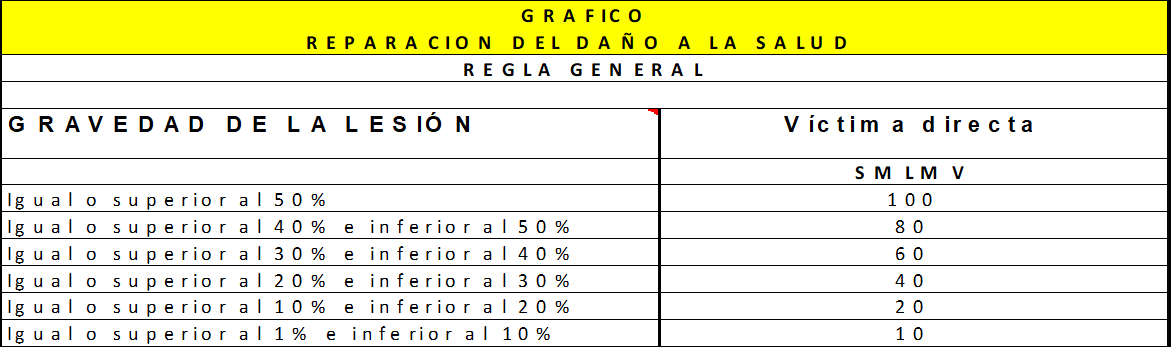 La indemnización, en los términos del fallo referido está sujeta a lo probado en el proceso, única y exclusivamente para la victima directa, en cuantía que no podrá exceder de 100 S.M.L.M.V, de acuerdo con la gravedad de la lesión, debidamente motivada y razonada, conforme a la siguiente tabla: