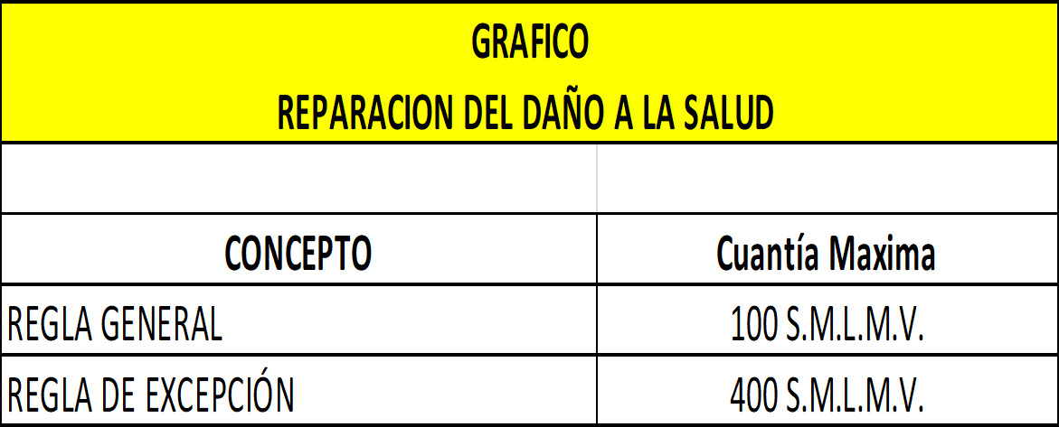 En casos excepcionales, esto es, cuando existan circunstancias debidamente probadas de una mayor intensidad y gravedad del daño a la salud podrá otorgarse una indemnización mayor a la señalada en la tabla anterior, sin que en tales casos el monto total de la indemnización por este concepto pueda superar la cuantía equivalente a 400 S.M.L.M.V. Este quantum deberá motivarse por el juez y ser proporcional a la intensidad del daño, con aplicación de las mismas variables referidas. En conclusión, la liquidación del daño a la salud se efectuará conforme a la siguiente tabla: