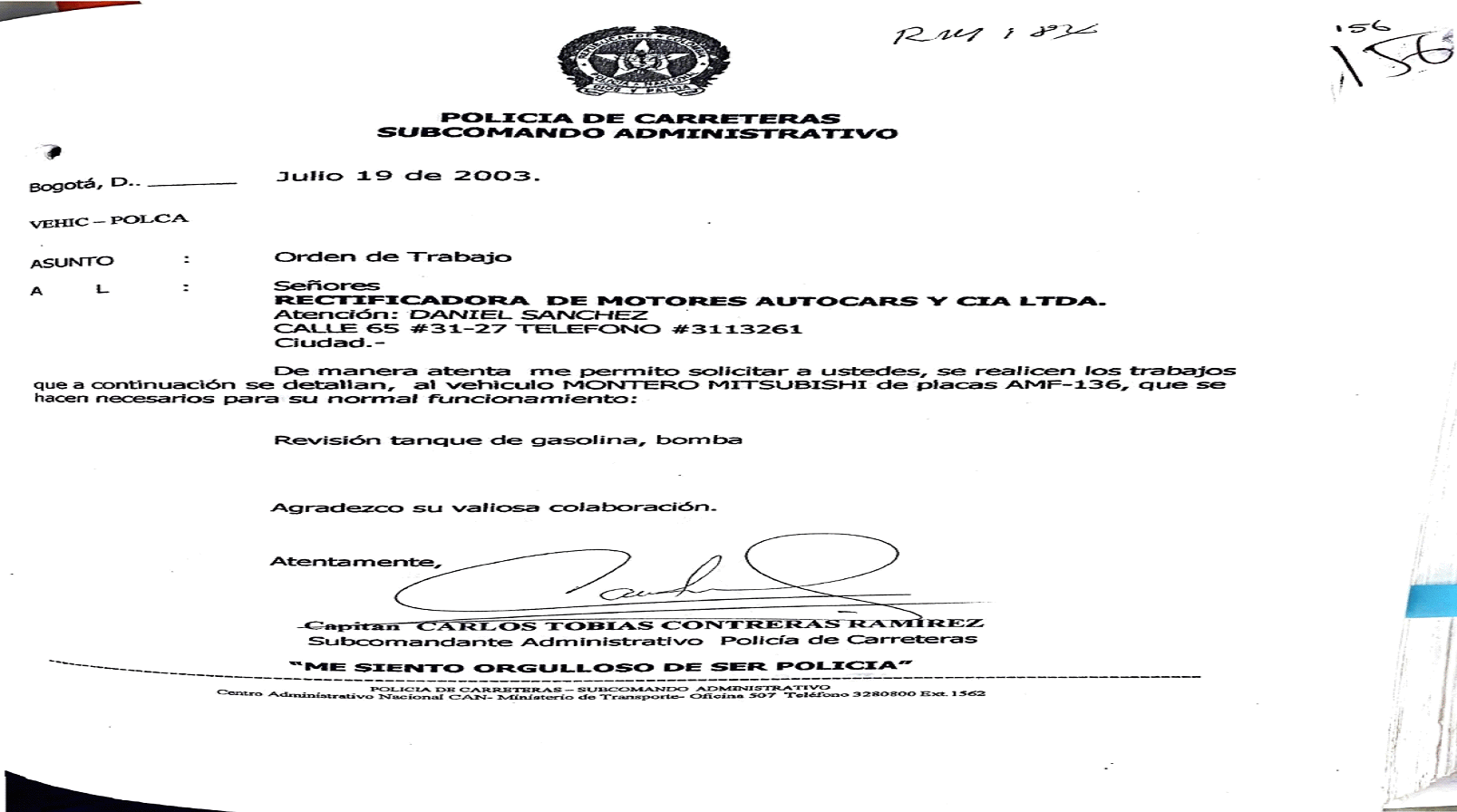 29.- Las órdenes de trabajo eran documentos expedidos por la Policía de Carreteras dirigidos concretamente a Autocar´s & Cía Ltda., en los que se solicitaban los trabajos sobre los vehículos oficiales, con una descripción general de la necesidad (i.e. mantenimiento preventivo, sincronización, revisión de frenos, etc…). A continuación, a título de ejemplo, la imagen de uno de estos documentos:
