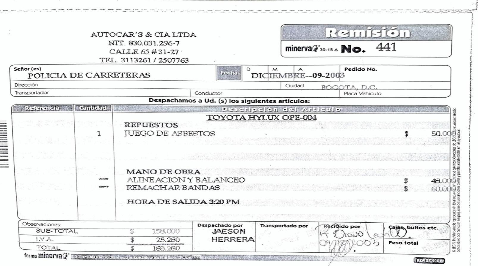 31.- Las remisiones eran documentos expedidos por Autocars & Cía. Ltda. en los que se señalaba como beneficiario a la Policía de Carreteras, se identificaba el vehículo sobre el cual se habían prestado los servicios y/o suministrado los repuestos, en cuya descripción se detallaba la información de precio e impuesto por cada uno de ellos. Los documentos de este tipo están suscritos en señal de “recibido”. A continuación, a título de ejemplo, la imagen de uno de estos documentos: