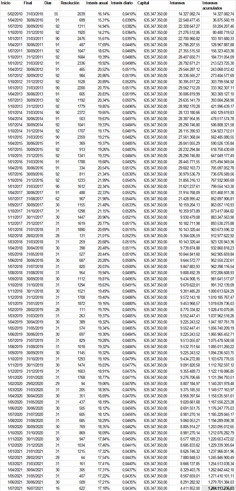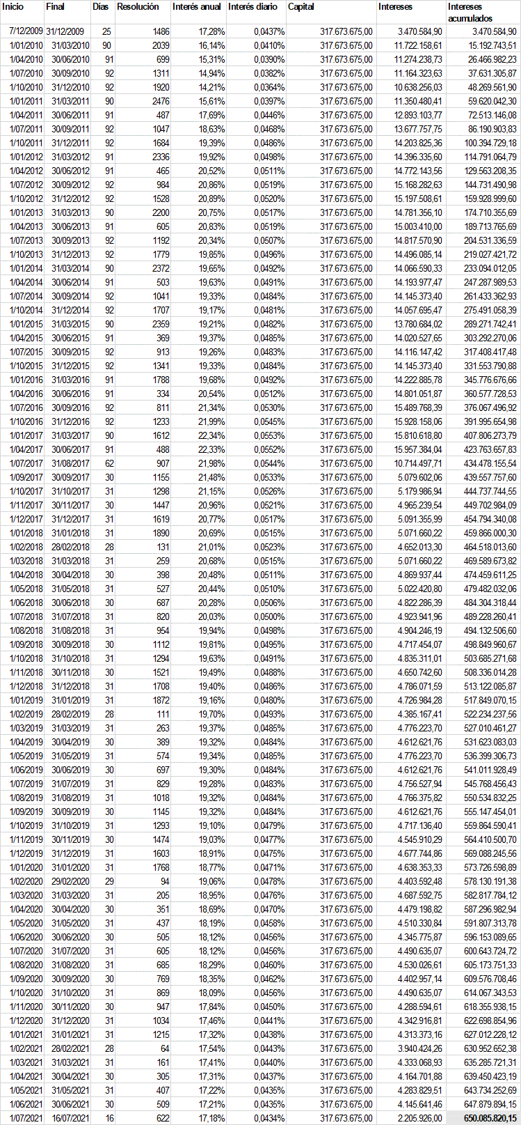 Los intereses adeudados por el saldo insoluto de la facturación del mes de septiembre de 2009 ascienden a $650'085.820,15, tal y como resulta de la siguiente liquidación: