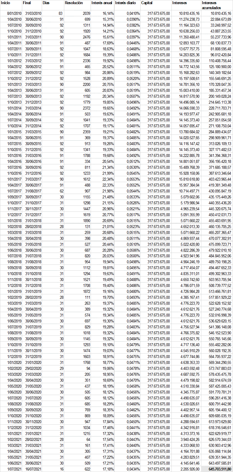 Los intereses por el saldo insoluto de la facturación del mes de octubre de 2009 ascienden a $645'703.511,80: