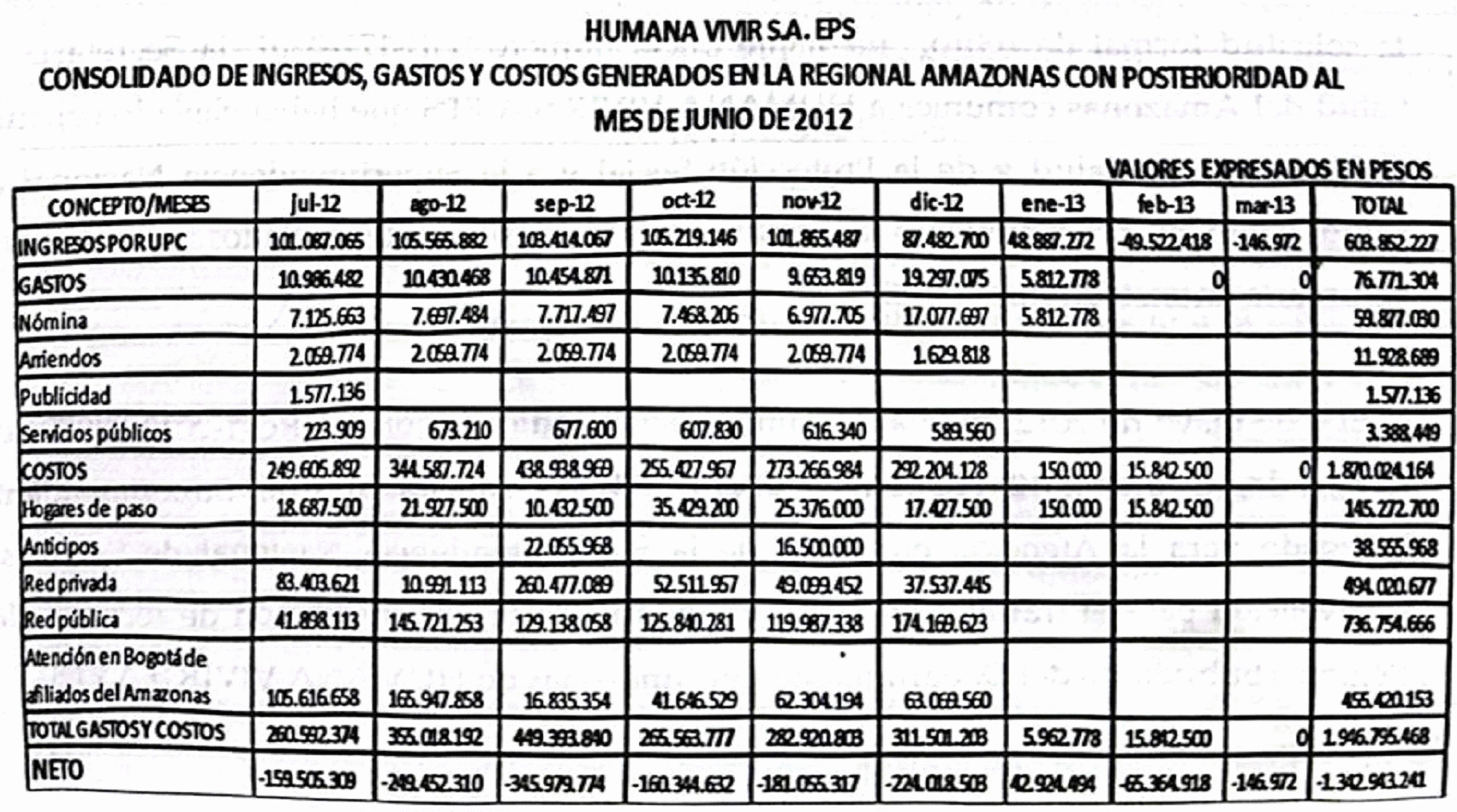 Informe, sin fecha, elaborado por el director del régimen subsidiado de Humana Vivir SA, Florentino Rincón Pabón, en el cual establece “la valorización del impacto negativo ocasionado a la EPS Humana Vivir SA por el proceso de intervención forzosa administrativa para administrar” (fl. 80 cdno. 3); para ello expuso que con posterioridad a junio de 2012 la EPS-S recibió seiscientos tres millones ochocientos cincuenta y dos mil doscientos veintisiete pesos ($603,852,227) por concepto de unidad de pago por capitación – UPC, y que como consecuencia de “las injustificadas demoras de la autoridad de salud en el Departamento del Amazonas en resolver la petición de retiro voluntario, Humana Vivir SA – EPS debió asumir gastos administrativos de funcionamiento que ascienden a la suma de setenta y seis millones setecientos setenta y un mil trecientos cuatro pesos ($76.771.304)”, discriminados así: