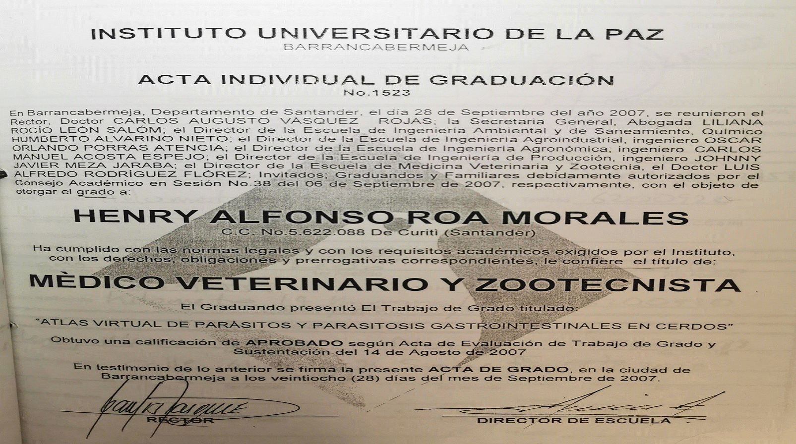 TERCERO: El Consejo Académico en sesión No. (sic) 38 del 6 de septiembre de 2007, autorizó otorgarle el título de Medico (sic) Veterinario y Zootecnista, a al (sic) señor HENRY ALFONSO ROA MORALES, mediante acta Individual de graduación No. (sic) 1523 de fecha 28 de septiembre de 2007, expedida en Barrancabermeja – Santander, por haber cumplido con las normas legales y con los requisitos académicos exigidos por el Instituto Universitario de la Paz, UNIPAZ.