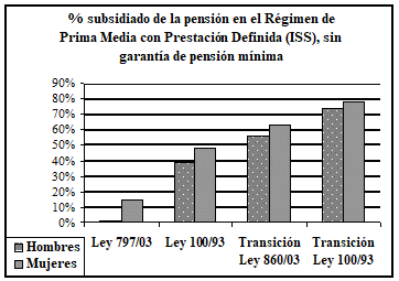 Los estudios económicos demostraban que de continuar aplicándose la Ley 100 de 1993, sin realizar los ajustes fiscales del caso, el Estado tendría que subsidiar con sus propios recursos el 39% de las pensiones de los hombres y el 48% de las mujeres. En la actualidad, con la reforma de la Ley 797 de 2003, a partir de la adopción de medidas sobre las variables que componen el cálculo actuarial, y modificando en menor medida los beneficios pensionales y la composición del presupuesto, el porcentaje que debe subsidiar el Estado se redujo drásticamente en un 1% en caso de los hombres y en un 15% en tratándose de mujeres. El presente gráfico aportado por el Ministerio de Hacienda y Crédito Público, refleja dicha realidad económica:
