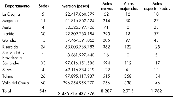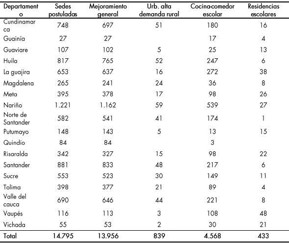 Mejoramiento general: por esta línea se espera atender los 32 departamentos con 1.493 sedes intervenidas, que equivalen al 11 % de las necesidades identificadas, atendiendo a cerca de 899 municipios.