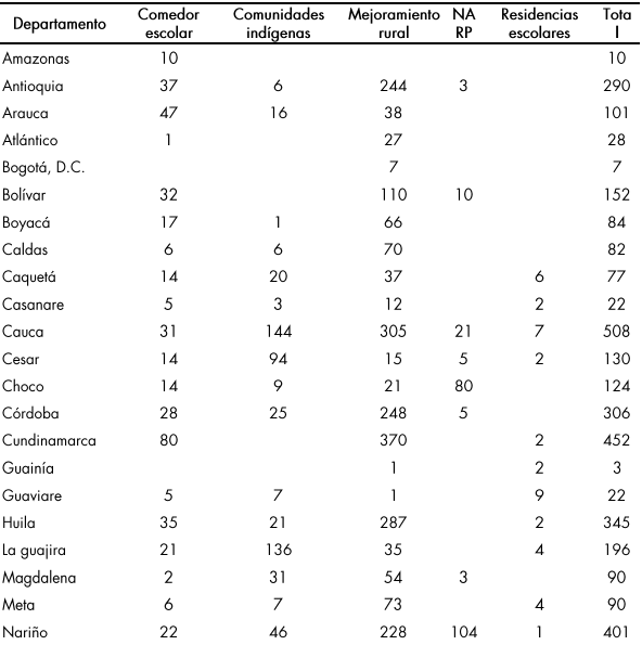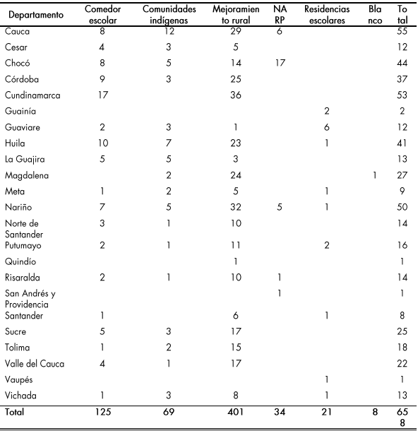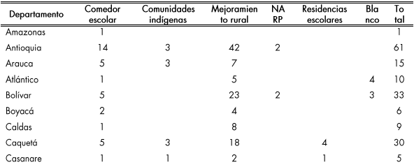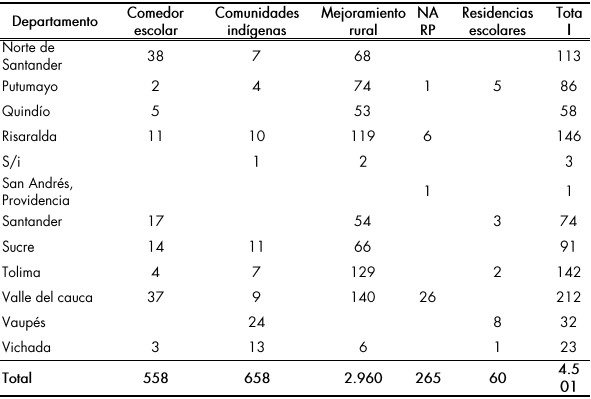 Comedores escolares: de las 4.568 sedes que se postularon se espera priorizar con estos recursos un total de 230 proyectos que equivalen al 5,2 %, lo anterior en los 32 departamentos, priorizando 230 municipios de los 578 postulados en la convocatoria.