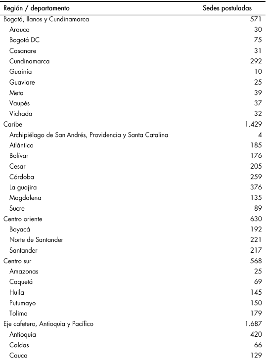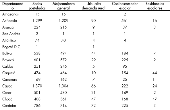 Zonas urbanas con alta demanda rural: con esta inversión se beneficiarán 29 departamentos que postularon sedes por esta línea, en cumplimiento de los parámetros de postulación, exceptuando los departamentos de Amazonas, Guarnía y Quindío que no se presentaron por esta línea de inversión. Se espera intervenir 290 sedes en igual número de municipios, que equivalen al 34 % de las 839 sedes postuladas.