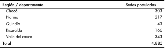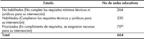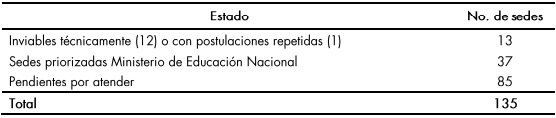 Por su parte, los compromisos adquiridos con la ETC de Quibdó establecen que el Gobierno nacional debe garantizar los recursos faltantes para la construcción de las sedes priorizadas. Dentro del total de sedes se incluyen 18 sedes que corresponden a las estructuradas por el FFIE en el marco de la convocatoria abierta por el Ministerio de Educación Nacional en el 201 6, y 20 sedes adicionales que fueron descartadas en el marco de la mesa del paro por no contar con viabilidad jurídica y técnica.