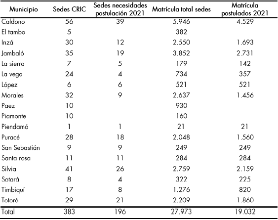 En cuarto lugar, en el marco de la concertación de 2019 con el CRIC (que representa 115 Cabildos y 11 Asociaciones de Cabildos), los compromisos se enmarcan en los componentes pedagógico, político y administrativo del Sistema Educativo Indígena Propio, que buscan fortalecer la política de educación de los pueblos indígenas adscritos al CRIC en los componentes de educación propia, lo cual incluye la inversión en infraestructura educativa y la dotación de mobiliario.