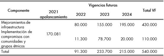 El horizonte temporal establecido para la implementación de acciones que respondan al objetivo planteado dentro de este documento contempla las vigencias 2022 a 2024. La ejecución de estas acciones se garantizará a través de la solicitud de una vigencia futura ordinaria por 540.000 millones de pesos; esto de acuerdo con el aval fiscal otorgado por el Consejo Superior de Política Fiscal el 6 de septiembre de 2021 y de conformidad con el artículo 10 de la Ley 819 de 2003[3] y el artículo 2.8.1.7.1.2 del Decreto 1068 de 2015[4].