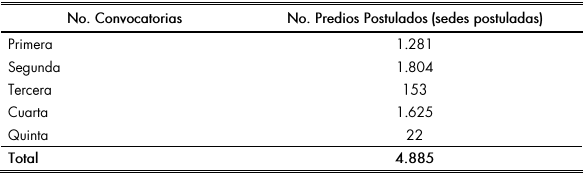 En dicha convocatoria se postularon 14.795 sedes de todo el país, las cuales se presentaron en 19.796 líneas de inversión de 32 departamentos, de 988 municipios. El proceso cerró la fase de subsanación de información documental y actualmente se encuentra en fase de evaluación previo a la priorización de obras de infraestructura educativa, y se espera contar con la publicación de resultados definitivos de verificación de condiciones técnicas y jurídicas en octubre de 2021.