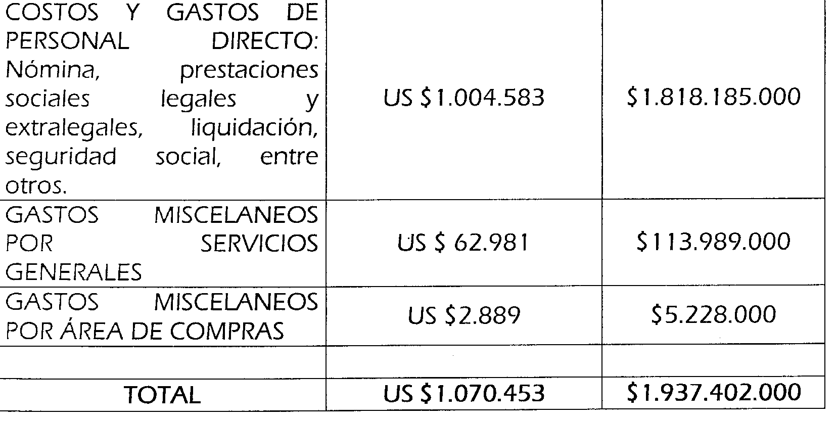 Incluyó el experto lo que denominó «costo inherente asociados al bloqueo ilegal» y «gastos relacionados en el área de compras». Dentro del primer concepto, indicó, se hallan comprendidos «los pagos o erogaciones realizadas por parte de GECOLSA SA para incrementar el cuerpo de seguridad de sus instalaciones, los cuales fueron efectuados a la empresa de seguridad SOS Su Oportuno Servicio, al igual que la alimentación entregada a los miembros del SMAT a través de Sodexo y otros proveedores, del mismo modo se evidencia un rubro por combustible suministrado al SMAT para el desplazamiento de los vehículos de esta institución. El monto total se soporta con facturas aportadas y registros contables certificados por el área financiera de la empresa por un costo total de $113.989.000, que equivalen a US$62.847»