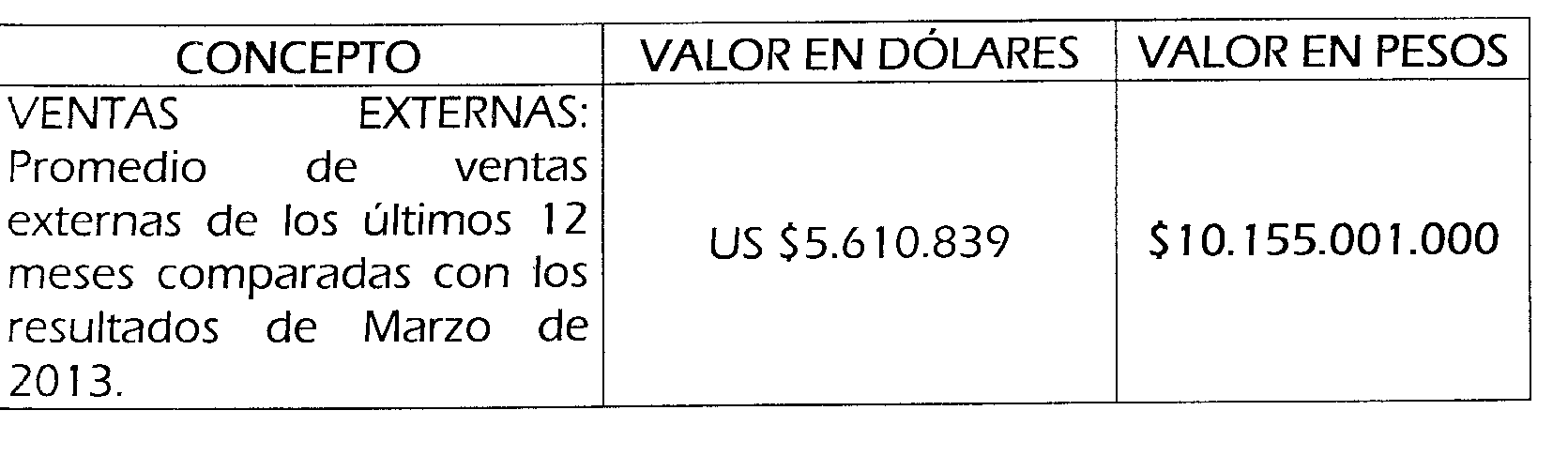 Para el cálculo que realizó tuvo en cuenta «las ventas generadas por GECOLSA S.A desde el mes de julio de 2012 hasta junio de 2013, dicha información se genera teniendo en cuenta cada uno de los centros de costo de ventas utilizados por GECOLSA S.A. para el desarrollo de su actividad comercial, totalizando dicha información en la suma de $612.757.415.568 (…)» y con esa información, efectuó «un promedio de ventas teniendo en cuenta los datos de cada centro de costo de ventas en cada mes, mostrando que el mes de marzo de 2013, presenta una disminución con referencia de los meses de febrero a junio del mismo año. El promedio de ventas en el periodo de 12 meses «se confronto (sic) con las ventas realizada (sic) por GECOLSA S.A en el mes de marzo de 2013, presentando una diferencia en la suma de $10.155.001.000, valor que se establece como las Ventas Frustradas sufrida por GECOLSA S.A en el mes de marzo de 2013»