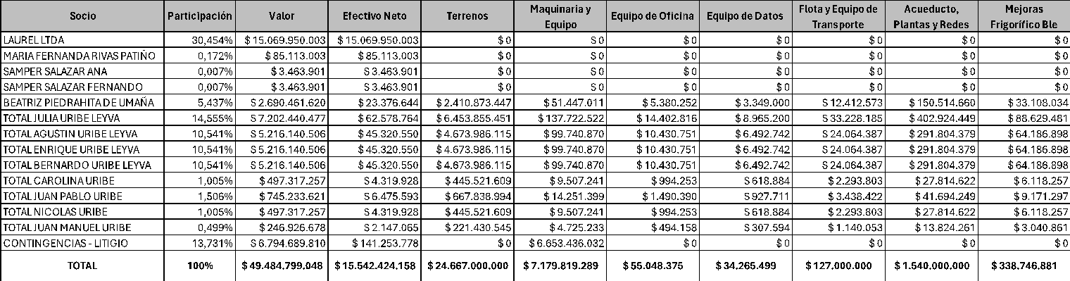 Como puede verse, la adjudicación de los bienes se dividió en dos grupos. De un lado, a Laurel Ltda., así como a otros tres socios con cuotas de participación ínfimas –de entre el 0,007% y el 0,17%–, se les asignó una cantidad de dinero, categorizada como «efectivo neto». A su turno, a los restantes asociados se les adjudicaron los muebles que conformaban la unidad productiva del frigorífico, así como el inmueble con folio de matrícula n.º 50C-100963.
