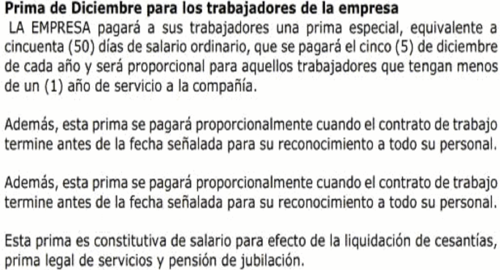 primas extralegales e incentivos de corto plazo para todos los trabajadores), artículo 51 (prima de diciembre para los trabajadores de la empresa); artículo 52 (prima de pascua para los trabajadores de la empresa); artículo 53 (prima de junio para los trabajadores de la empresa) y artículo 54 (prima de descanso para los trabajadores de la empresa).