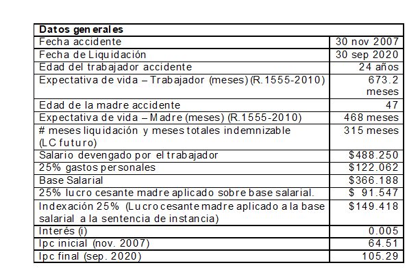 Así las cosas, el período de meses a liquidar por lucro cesante futuro, en este caso, corresponde a la vida probable de la madre del fallecido a la fecha de ocurrencia del accidente, según lo previsto en la Resolución 1555 de 2010.