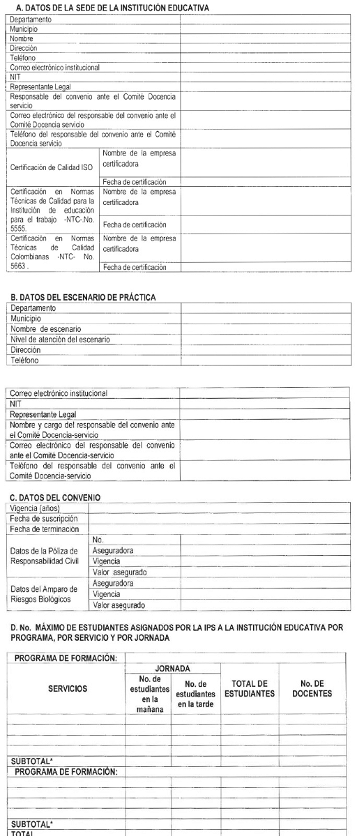 Los Formatos 2, 3 y 4 deben ser diligenciados de manera conjunta por la Institución de Educación para el Trabajo y Desarrollo Humano y el Escenario de Práctica (IPS u otro).