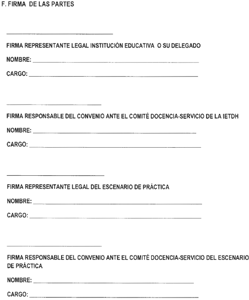 ARTÍCULO 3o. CONVENIOS DOCENCIA-SERVICIO. La relación docencia-servicio tiene carácter institucional y se desarrollará mediante la suscripción de un convenio que se ajustará a lo establecido en el presente acuerdo. Dicho convenio deberá contener, como mínimo, los siguientes ítems: