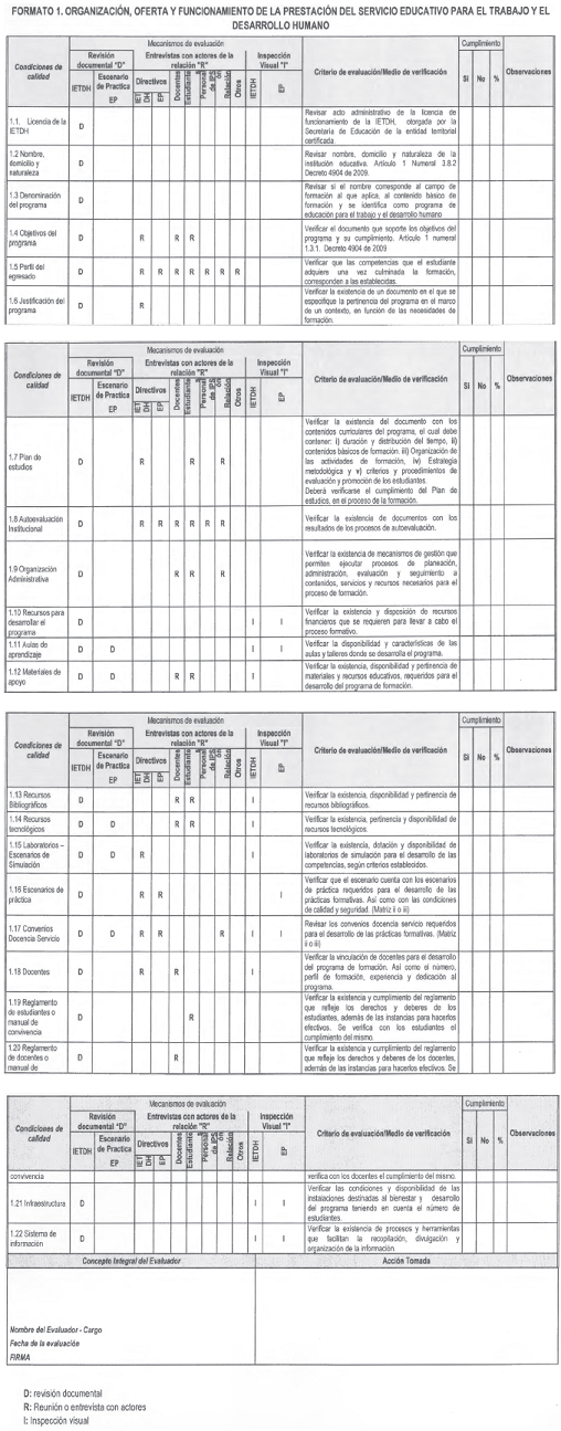 El instrumento está compuesto por cuatro (4) formatos: FORMATO 1: Organización, oferta y funcionamiento de la prestación del servicio educativo para el trabajo y el desarrollo humano que corresponde a los criterios establecidos en el Decreto número 4904 de 2009, debe ser diligenciado por la Institución de Educación para el Trabajo y Desarrollo Humano; el FORMATO 2: Relación docencia servicio - Escenarios clínicos, corresponde a la evaluación de las condiciones de calidad establecidas por la CITHS para los escenarios de práctica clínicos; el FORMATO 3: Relación Docencia Servicio - Escenarios no clínicos[2], evalúa las condiciones de calidad de los escenarios de práctica no clínicos tanto comunitarios o institucionales; y como resultado del proceso de autoevaluación, el FORMATO 4: Plan de mejoramiento.