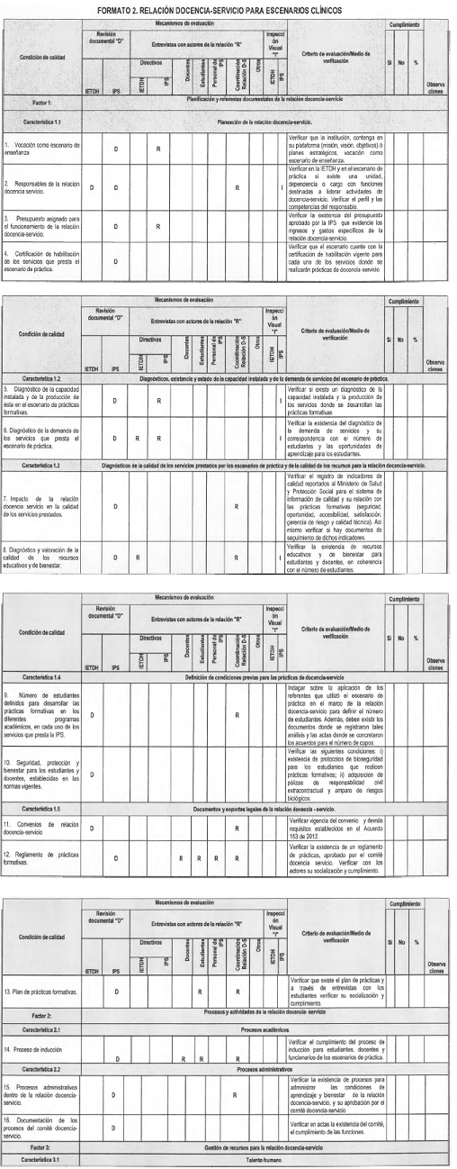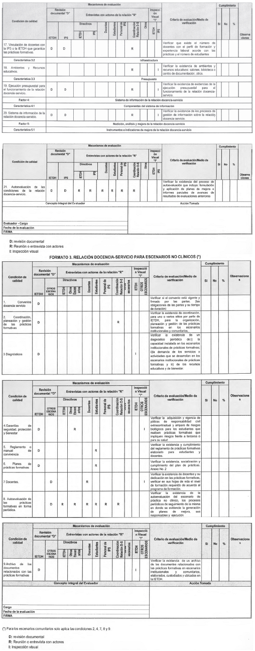 Condiciones de calidad: En el Formato 1 se describen las condiciones de calidad definidas en el Decreto número 4904 de 2009; en los Formatos 2 y 3[3] las condiciones de calidad definidas por la CITHS en el marco del Decreto número 2376 de 2010, sobre la relación docencia-servicio.