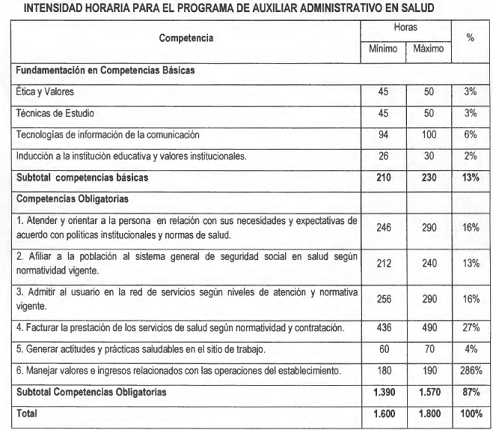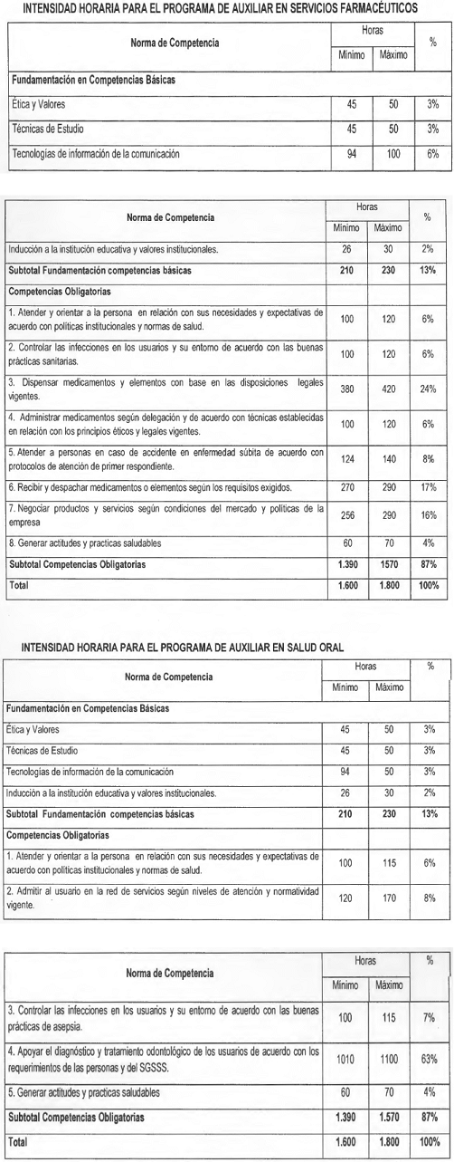 c) Intensidad horaria del programa: La intensidad horaria total del programa deberá estar entre 1.600 y 1.800 horas, de las cuales el 60% corresponde a práctica y el 40% a teoría. Además debe establecer la intensidad horaria para el desarrollo de las competencias, determinando horas teoría, horas prácticas y guardando la proporción antes señaladas, conservando los rangos señalados en el Anexo Técnico número 4 “Rangos de Intensidad Horaria para los Programas de Auxiliares de la Salud”;