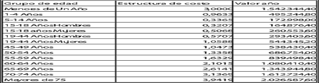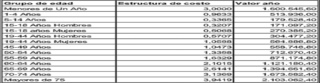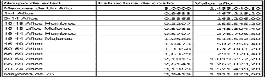 La estructura de costo por grupo etareo de la UPC diferencial por zona geográfica ciudades de Bogotá, Cali, Medellín y Barranquilla, y a los municipios de Soacha, Bello, Itagüí, Envigado, Sabaneta y Soledad es la siguiente: