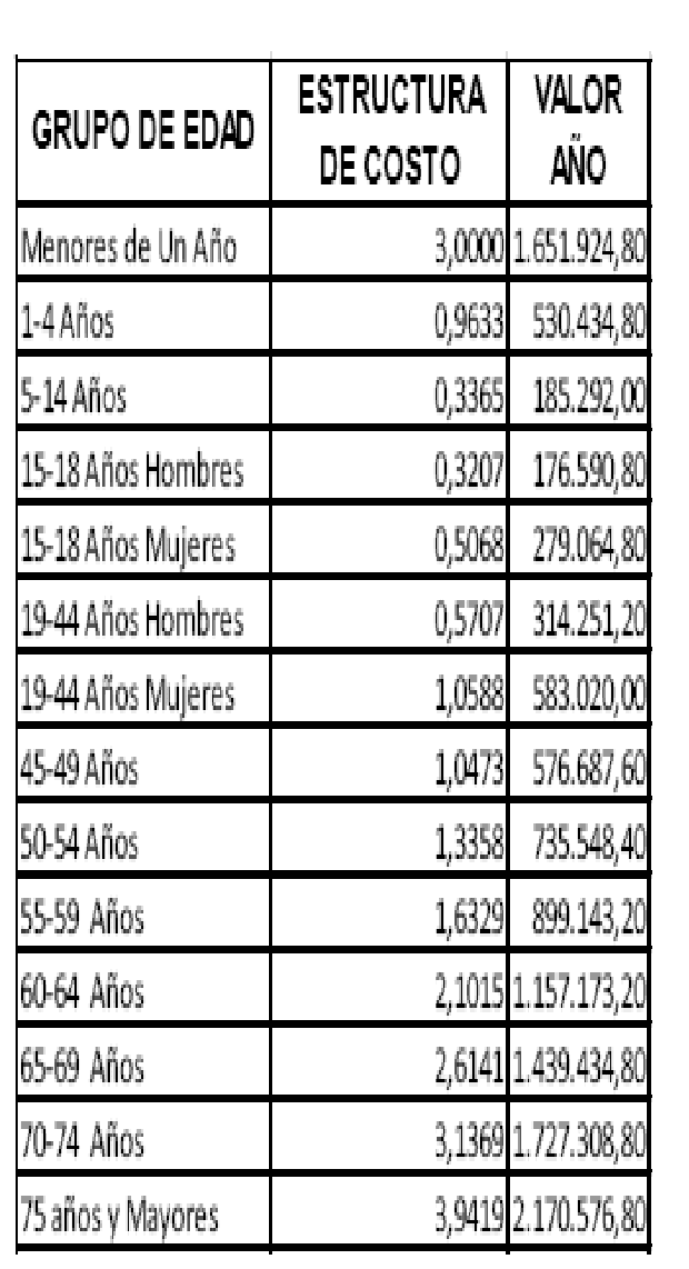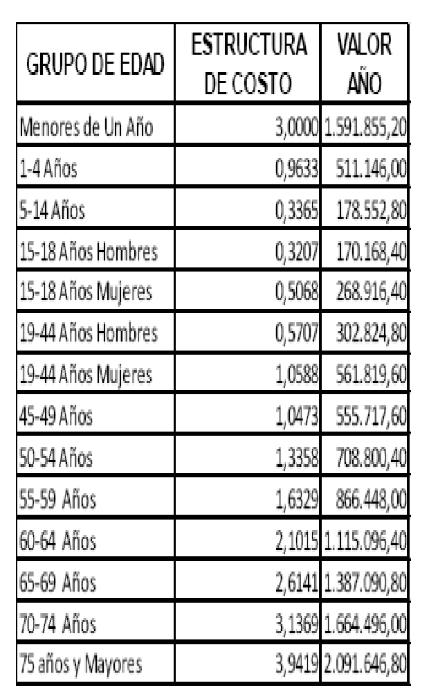 La estructura de costo por grupo etario de la UPC diferencial por zona geográfica especial es la siguiente: