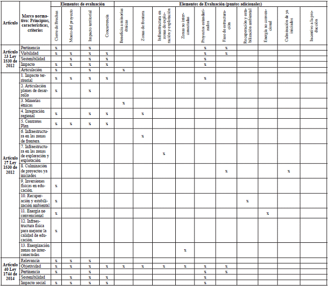 3. Relación entre marco normativo y elementos de evaluación: la relación entre los elementos de evaluación y los criterios y características definidos en las Leyes 1530 de 2012 y 1744 de 2014, se presenta en la siguiente tabla: