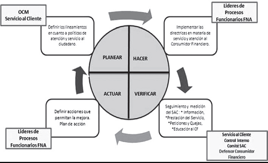 En concordancia con lo anterior y de manera gráfica las responsabilidades frente a la implementación del Sistema de Atención al Consumidor Financiero integradas al P-H-V-A para el Fondo Nacional del Ahorro se pueden resumir en el siguiente gráfico para un mayor entendimiento: