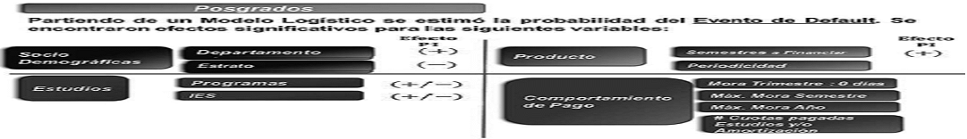 Se construyó un solo modelo para la cartera de posgrados en razón a las similitudes encontradas: comportamiento de pagos y el número de días en mora en la identificación del default, adicionalmente en la cartera de exterior no se encontró un número de defaults suficientes para la construcción de un modelo independiente.