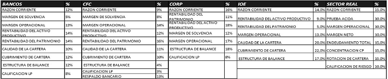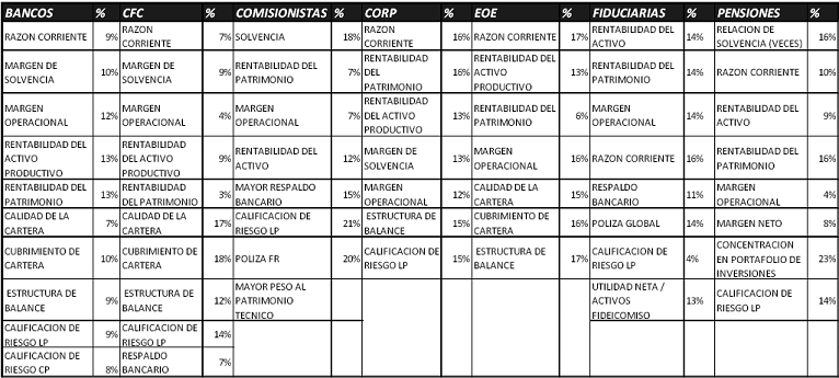 De conformidad con lo anterior, los indicadores financieros y los indicadores de gestión (Calificación de Riesgo del Emisor y Contraparte) que se aprueban para cada tipo de emisor y contraparte, al igual que la respectiva ponderación son:
