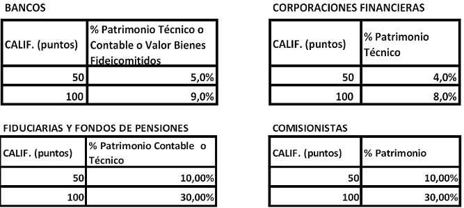 Para establecer el cupo máximo por emisor o contraparte de cada entidad se debe tomar el valor de su patrimonio técnico o contable, según el sector a que pertenezca, el cual se multiplica por el porcentaje de asignación determinado por las anteriores tablas y curva exponencial así: