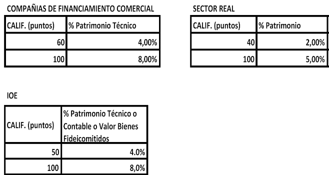 La asignación de cupo por emisor y contraparte basado en el grupo de riesgo al que pertenezca es obtenida en términos del puntaje total generado, el cual se transformará en un porcentaje de asignación a través de una curva exponencial construida para cada sector a partir del rango de puntajes de aprobación frente al rango de porcentajes de patrimonio técnico o contable, definidos a continuación: