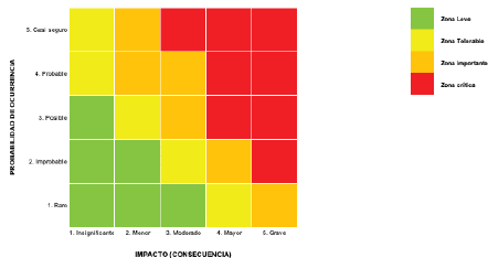 | Posible | 3 | El evento podría ocurrir en algún momento. | Al menos una vez se ha presentado el evento en los últimos seis meses. |