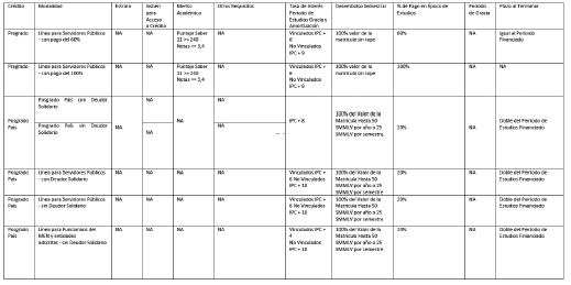 Beneficiarios de crédito educativo en la línea de pregrado, bajo las modalidades Tú Eliges 0% y 25%, Línea de crédito educativo zonas especiales 10%, Alianzas, Ceres 25% y Protección Constitucional a partir del primer semestre de 2011 registrados en la base de datos del SISBÉN o en cualquier mecanismo adoptado por el Gobierno nacional para la focalización de programas.