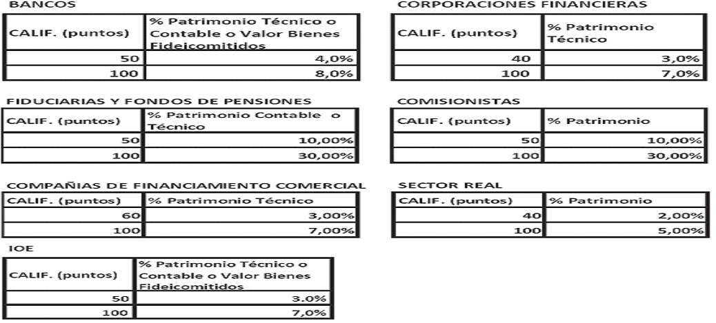 La asignación de cupo por emisor y contraparte basado en el grupo de riesgo al que pertenezca es obtenida en términos del puntaje total generado, el cual se transformará en un porcentaje de asignación a través de una curva exponencial construida para cada sector a partir del rango de puntajes de aprobación frente al rango de porcentajes de patrimonio técnico o contable, definidos a continuación: