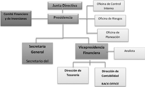 Para los aspectos estratégicos la estructura se encuentra compuesta por la Junta Directiva, el Comité Financiero y de Inversiones y el Comité CAP. Las funciones de dicha estructura en lo relacionado con la gestión de riesgos contempla, entre otras, discutir y aprobar las estrategias, las políticas y las reglas de actuación, conocer los resultados obtenidos y los riesgos asumidos, garantizar la existencia y asignar los recursos necesarios para la gestión de riesgos, fijar los límites para la toma de riesgos y adoptar las medidas organizacionales necesarias para limitarlos. En tal sentido, la estructura orgánica que interviene en el conjunto de la aplicación del sistema Sarm es la siguiente:
