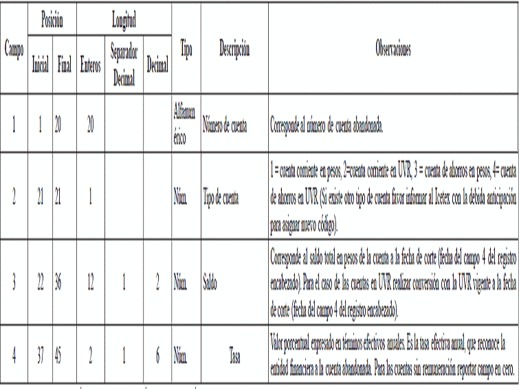 | 2 | Entrega Cuentas Abandonadas | Sigla Fija = EA, igual para todos los archivos de traslado de saldos de cuentas abandonadas. |