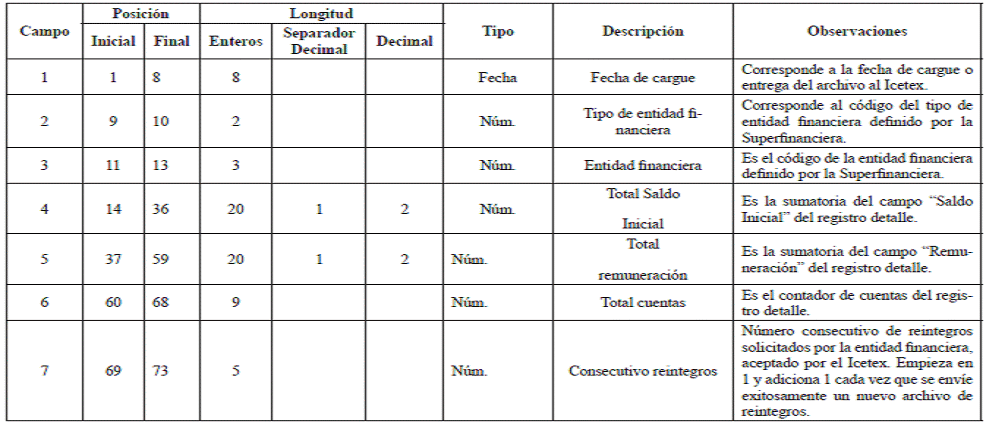 | 5 | Número de Secuencia de Reintegros de cuentas Abandonadas aceptado por Icetex. | Consecutivo que denota el archivo a reportar. Coincide con el Registro Encabezado “Consecutivo Reintegros”. |